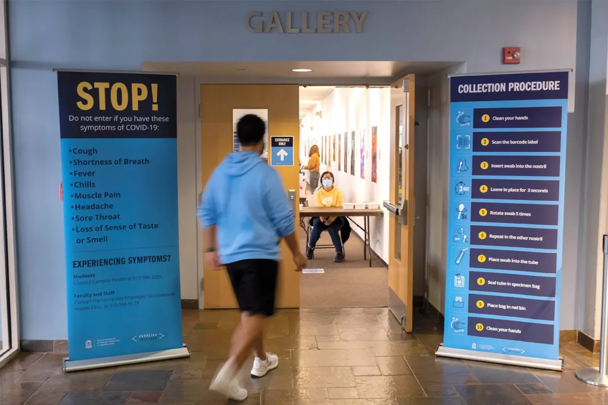 A person approaches a COVID-19 testing location on the campus of the UNC-Chapel Hill.