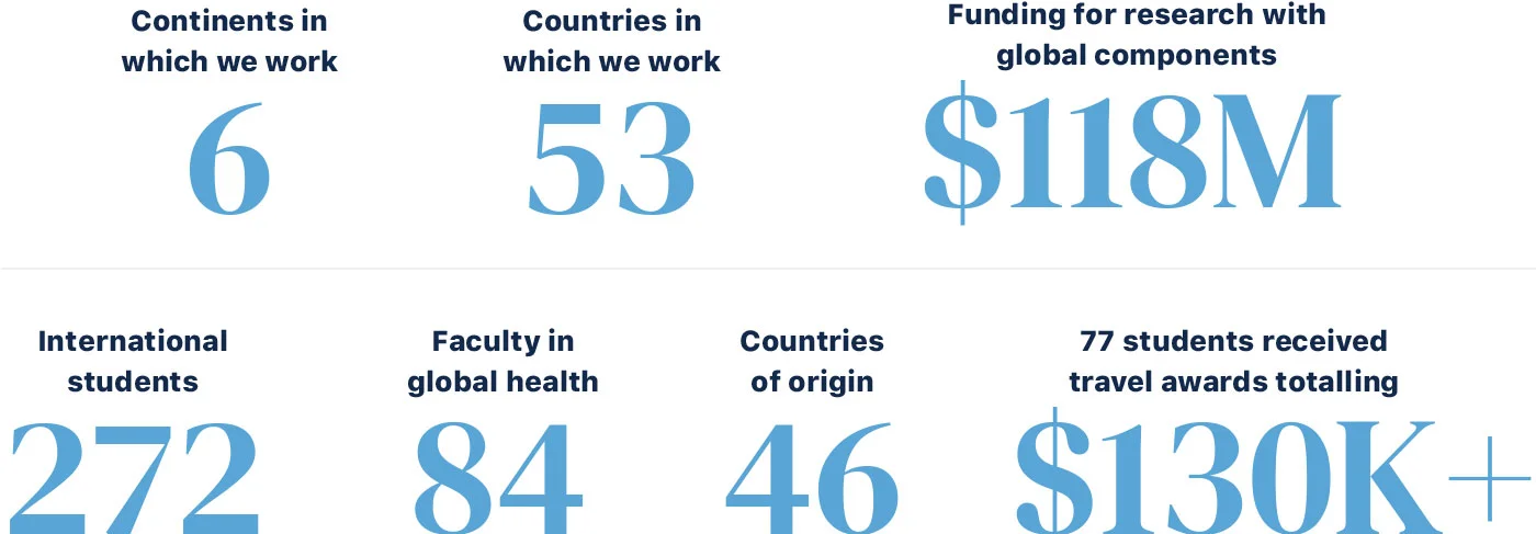 We maintained our global work in the face of COVID-19, with our work spanning 45+ countries focusing on a wide range of health problems, settings and approaches. More than 80 of the 240 faculty members at Gillings focus on global health, working across our eight departments. In FY 21-22, our funding for research that included global components was $118 million, making up about 42% of total funding to the Gillings School.