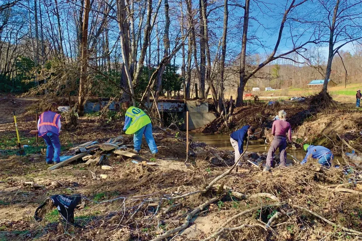 Volunteers from the Gillings School and the local community clear debris from a creek in Fairview, N.C., one of many flood-affected areas hit hard by Hurricane Helene.