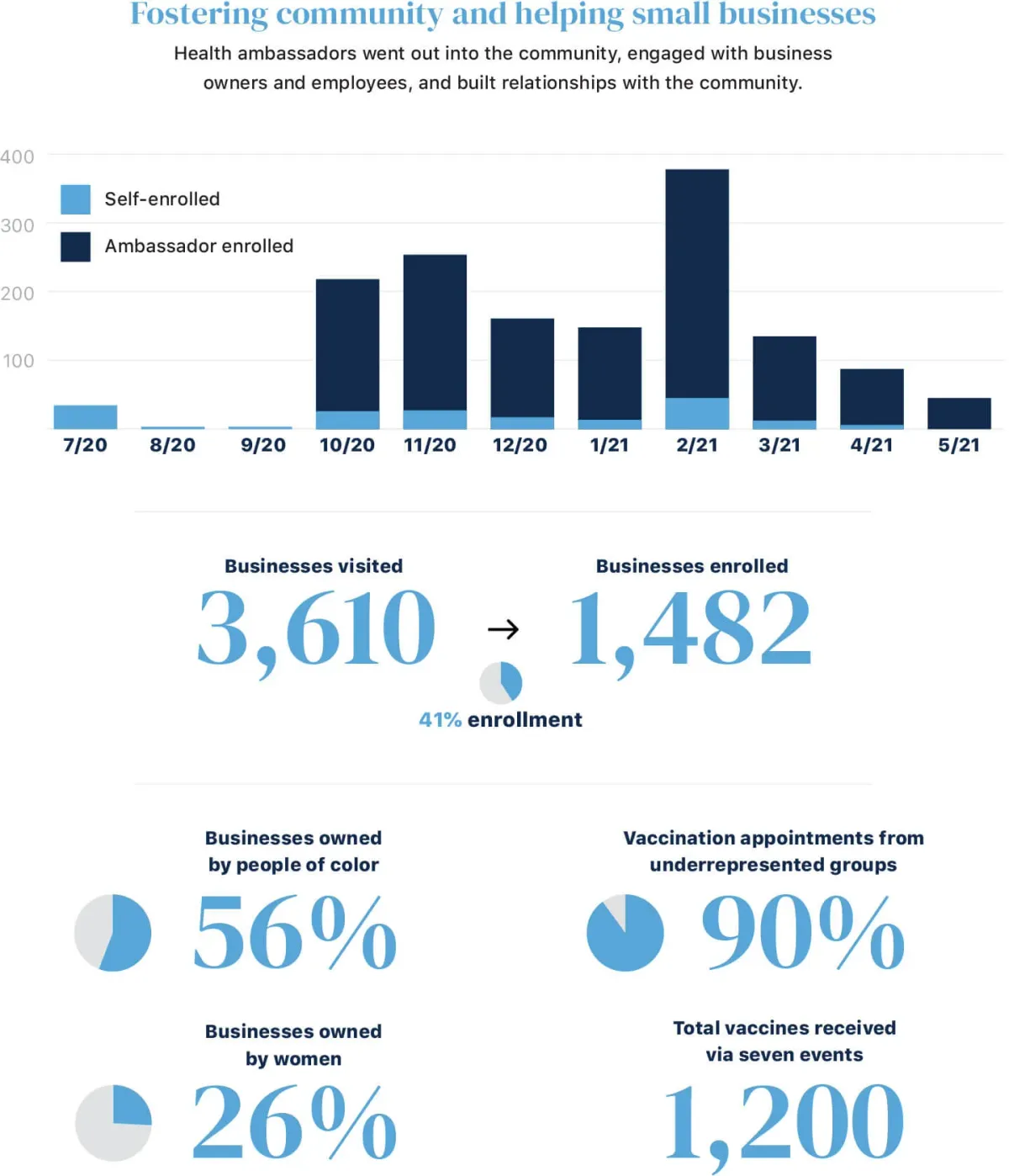When COVID-19 vaccines began to be distributed, appointments were extremely difficult to come by — and Black, Latinx and Indigenous populations already had disproportionately higher rates of COVID-19 illness and death than white populations. The Ambassadors worked to reduce that disparity, focusing on making appointments for essential workers at the grocery stores, gas stations and restaurants they had gotten to know over the summer.