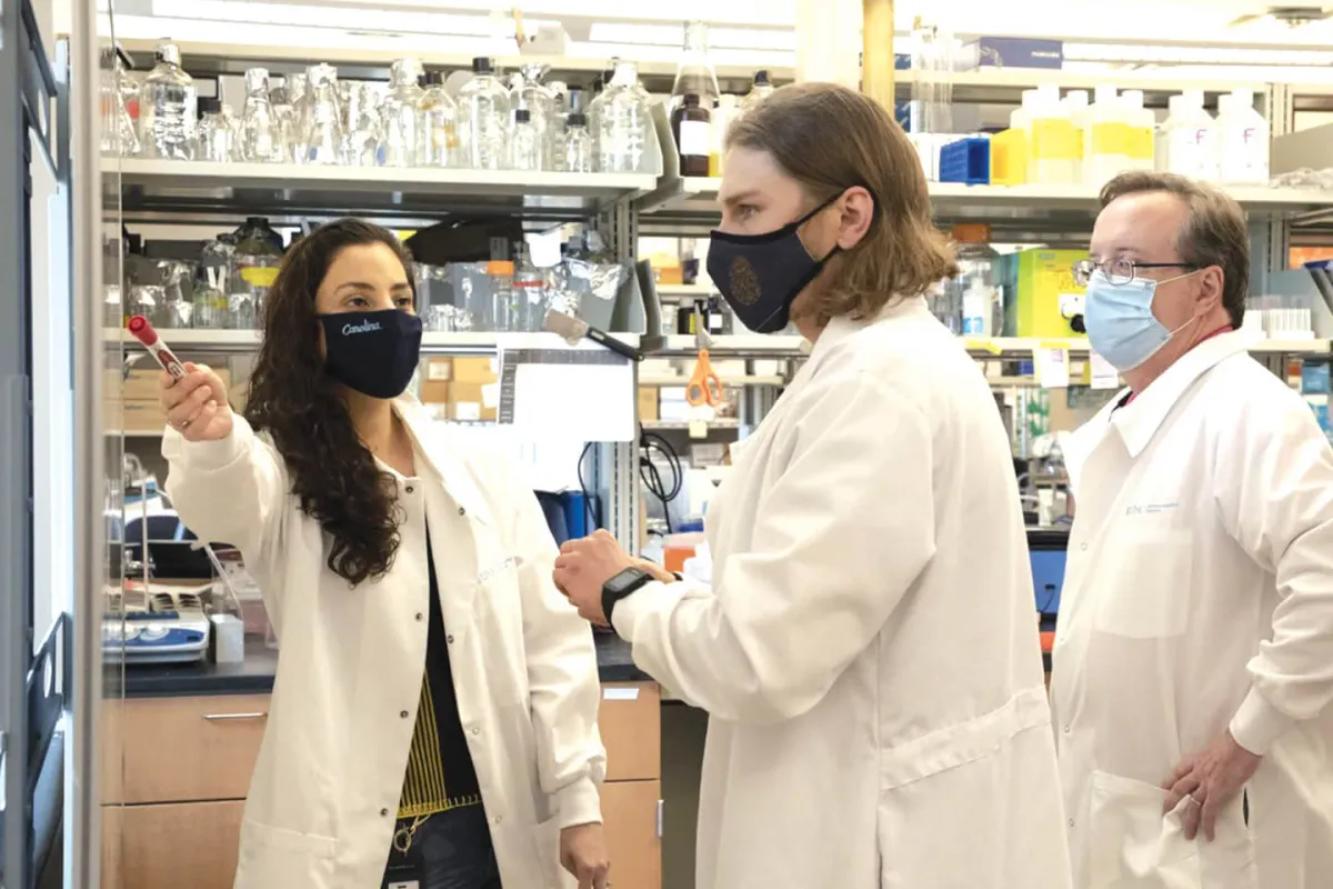 Iris Trujillo (left) and Walter Friday (right) in the Nutrition Research Institute discuss an experiment with doctoral student Evan Paules (center). (Photo by Alyssa LaFaro)
