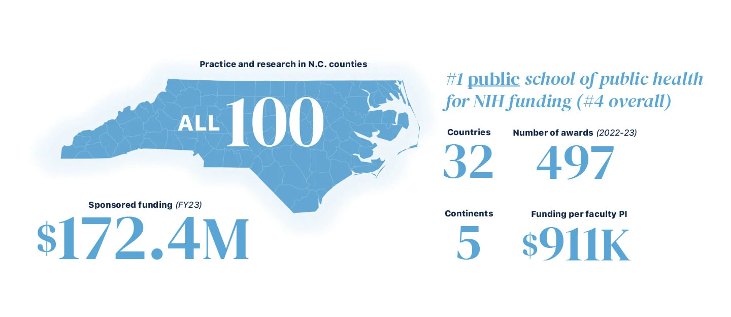The Gillings School’s research portfolio comprises impactful work with a cells-to-society approach, from basic science to implementation and policy change. The research is highly collaborative, including faculty, staff and students within the School and across UNC and beyond. Our research is both local to N.C. and global. Reducing health inequities and working with communities are important components of our research, and student engagement is a foundational training element.