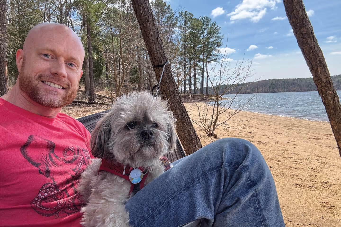 Earnest relaxes outdoors with his pup, Tommy Pickles.