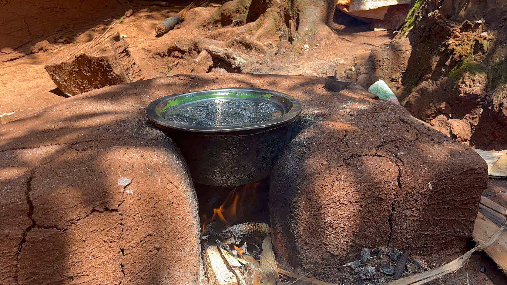 One family warmly welcomed us into their living space, offering a guided tour with shy smiles and gestures. They showed us their outdoor kitchen area, where food simmered slowly over a smoky fire, filling the air with the rich aroma of stewing vegetables. The mother eagerly pointed to old repurposed containers ingeniously fashioned into a makeshift running stream for washing hands.